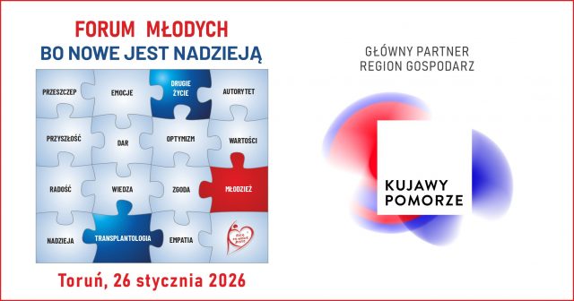 Forum Młodych – BO NOWE JEST NADZIEJĄ w Toruniu zbliża się wielkimi krokami. Już 26 stycznia w Ogólnopolskim Dniu Donacji i Transplantacji uczniowie szkół ponadpodstawowych z województwa kujawsko-pomorskiego zasiądą w Kujawsko-Pomorskiej Arenie Toruń, by poszerzać swoją wiedzę o donacji i transplantacji, poznać historie osób po przeszczepieniu, przekonać się, że transplantacja daje drugie życie. Partnerem Wydarzenia jest Marszałek Województwa Kujawsko-Pomorskiego i jest ono współfinansowane ze środków budżetu Samorządu Województwa Kujawsko-Pomorskiego. Dzięki Waszemu wsparciu młodzież dowie się, że mamy w sobie niejedno życie!